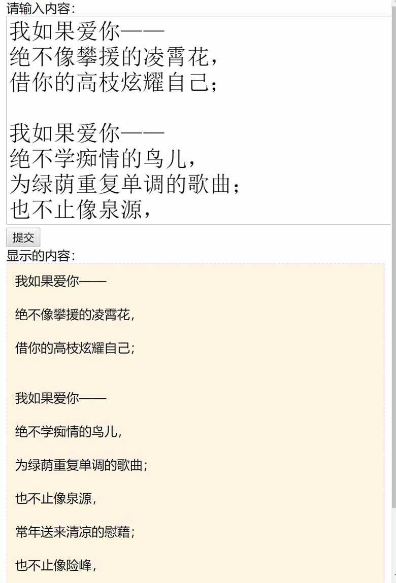 將 div 替換成 pre 標簽,將提交的文本顯示在 pre 標簽里面。pre 元素可定義預格式化的文本。被包圍在 pre 元素中的文本通常會保留空格和換行符,他比較常見的應用就是用來顯示代碼,在技術網站和博客的頁面里面,pre 標簽都是用來包裹代碼塊的。