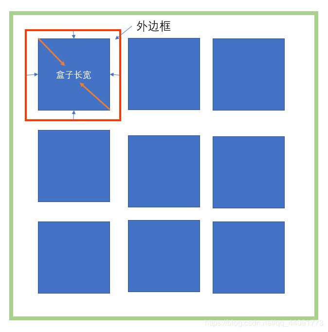 上圖是一個(gè)九宮格示意圖,現(xiàn)在我們把它想象到一個(gè)網(wǎng)頁(yè)中(想象不到就看上圖圖片~~),在網(wǎng)頁(yè)中這個(gè)布局由最外層綠色的大的div標(biāo)簽包裹,在綠色的div標(biāo)簽中有許多藍(lán)色的小的div標(biāo)簽作為綠色div標(biāo)簽的子級(jí)元素組成,這樣簡(jiǎn)單的嵌套就完成了。由于我們的目標(biāo)元素是藍(lán)色的小div,那么我們無(wú)可避免的要對(duì)其設(shè)置盒子大小,以及外邊距等等。但是我們操作的對(duì)象就是盒子的大小+外邊距(也就是上圖中紅色框選的區(qū)域)。