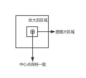 首先選擇圖片的一塊區(qū)域,然后將這塊區(qū)域放大,然后再繪制到原先的圖片上,保證兩塊區(qū)域的中心點(diǎn)一致, 如下圖所示: