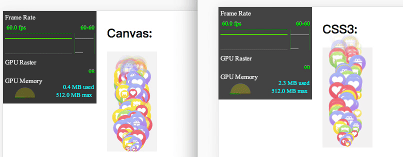 我們來看下兩者的數據對比。以下為未開啟硬件加速的對比,采用不間斷瘋狂渲染點贊動畫的數據對比: