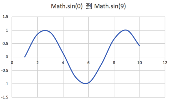 這是 Math.sin(0) 到 Math.sin(9) 的曲線圖走勢圖,它是一個平滑的從正數到負數,然后再從負數到正數的曲線圖,完全符合我們的需求,于是我們再需要生成一個隨機比率值,讓擺動幅度隨機起來。