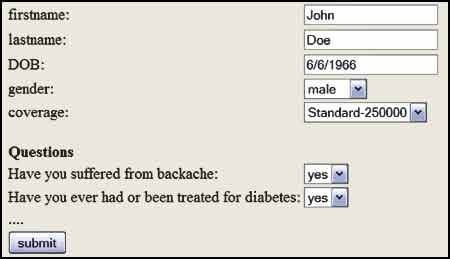 為了申請一個新的保險,客戶需要提供一些基本信息。部分信息是在一個 php 應用程序中填寫的,還有一部分是在客戶機瀏覽器中填寫的。然后,保單存儲在一個 db2 xml 列中。在 db2 9 中,xml 類型的列在內部將 xml 數據存儲為一棵解析后的樹,與關系數據存儲在不同的地方。這種方法是 db2 9 特有的,更早的 db2 版本則使用關系存儲基礎設施來存儲 xml。