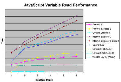 和上個測試一樣,internet explorer和firefox還是最慢的,opera表現(xiàn)了非常搶眼的性能,而同樣的,chrome和最新版本的webkit午夜版顯示了和作用域深度無關(guān)的性能趨勢,同樣需要注意的是,firefox 3.1 beta 2的變量訪問時間還是會伴隨著深度出現(xiàn)一個奇怪的跳躍。