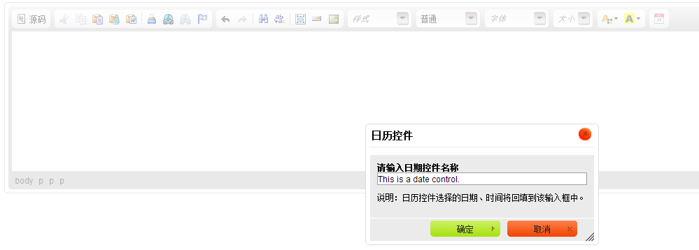 CKEDITOR.dialog.add('date', function(editor){ var escape = function(value){ return value; }; return { title: '日歷控件', resizable: CKEDITOR.DIALOG_RESIZE_BOTH, minWidth: 300, minHeight: 80, contents: [{ id: 'cb', name: 'cb', label: 'cb', title: 'cb', elements: [{ type: 'text', label: '請(qǐng)輸入日期控件名稱', id: 'lang', required: true, },{ type:'html', html:'<span>說(shuō)明:日歷控件選擇的日期、時(shí)間將回填到該輸入框中。</span>' }] }], onOk: function(){ lang = this.getValueOf('cb', 'lang'); editor.insertHtml("<p>" + lang + "</p>"); }, onLoad: function(){ } };});