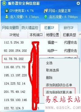 如果需要對攔截的ip做些操作,用戶可以選中攔截的IP,然后右鍵點擊,該信息框便會彈出一個對話框,可根據需要對攔截的ip做處理(該對話框的功能包括:全選、取消選擇、刪除、添加到超級白名單、添加到超級黑名單、搜索等功能),例如用戶要將此攔截的IP添加到超級黑名單中。如圖所示:
