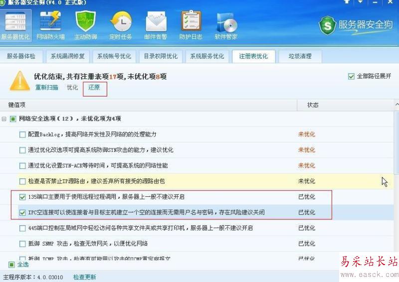 如果用戶進行注冊表優化之后,遇到任何系統異常,可以通過使用“還原”對導致系統異常的注冊表優化操作進行還原,即可解決異常問題。