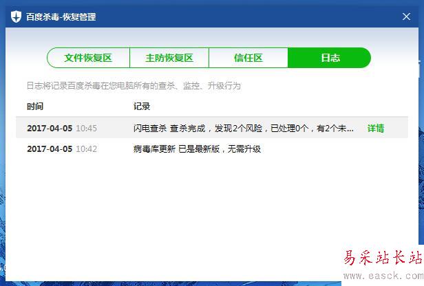 2、來到恢復管理界面后,我們打開“日志”界面,在這里就可以看到百度殺毒的所有日志了。