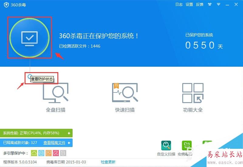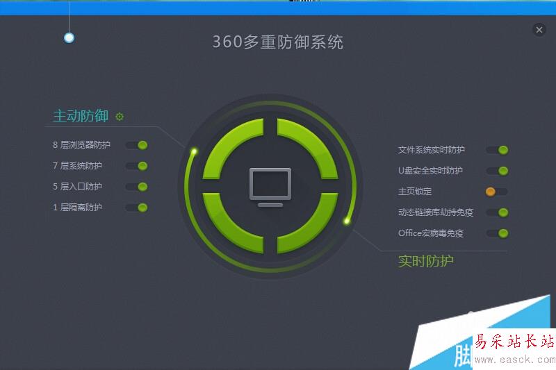 2、點擊左上角的圓圈,查看360殺毒防護狀態(tài),如圖所示: