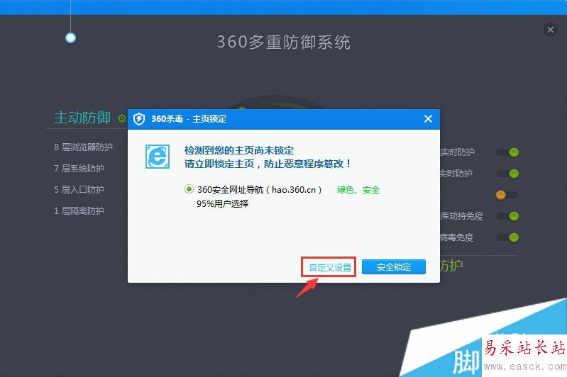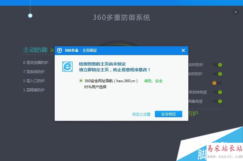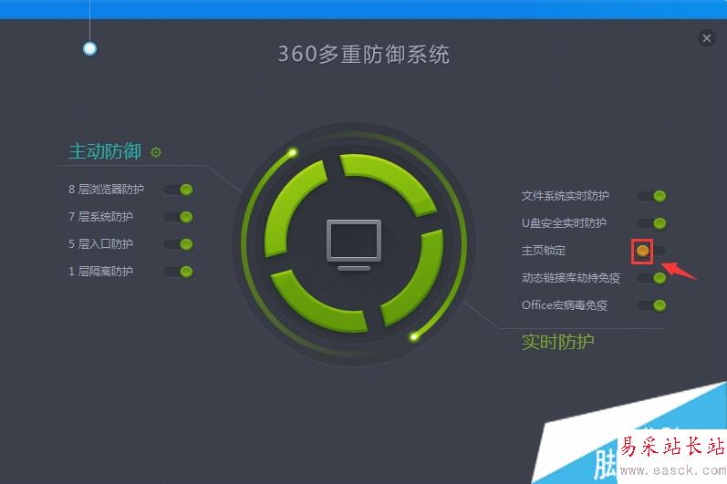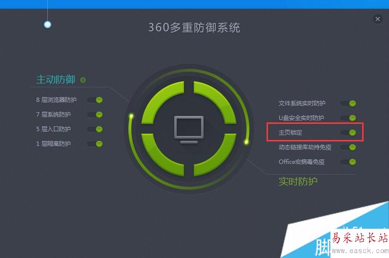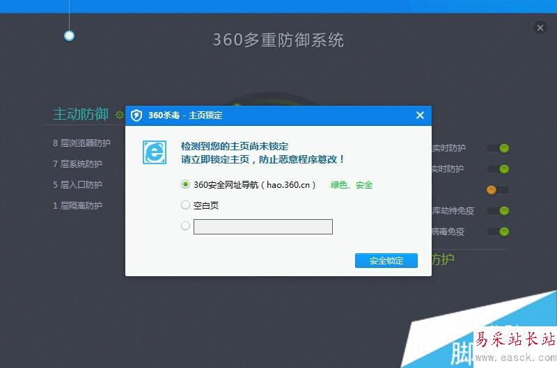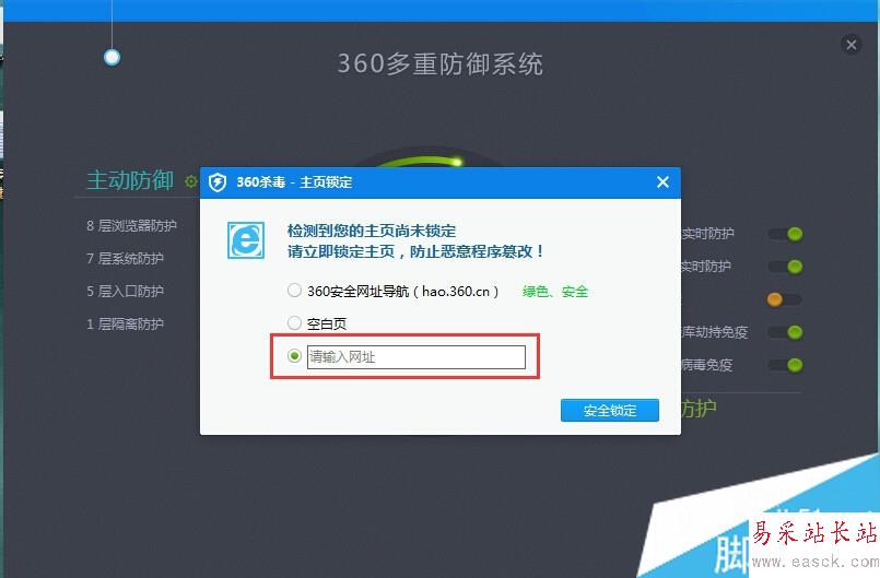 3、點擊【360多重防御系統(tǒng)】中的【主頁鎖定】右邊的黃色小圓圈,彈出主頁鎖定對話框,如圖所示: