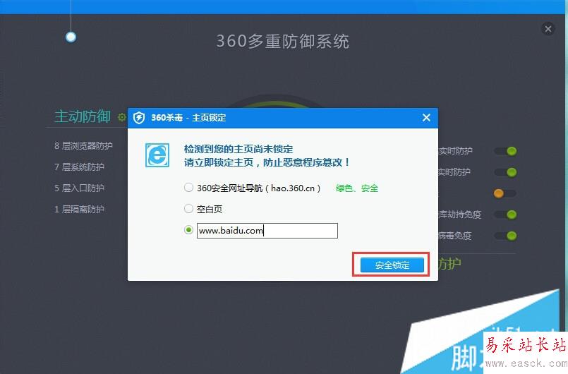 5、在最下面的方格中輸入需要做為主頁的網(wǎng)址,然后點擊【安全鎖定】,至此360殺毒將主頁鎖定,如圖所示: