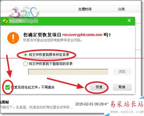 6、選擇將文件恢復到原文件所在目錄,并勾選恢復后信任此文件。點擊恢復即可。