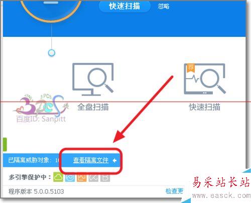 4、回到360殺毒主界面,點擊左則滑動條,滑動出已隔離威脅對象,點擊查看隔離文件。