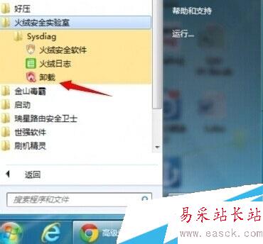 1:大多數的軟件都會帶上一個卸載的工具火絨互聯網安全軟件也不例外,點擊開始菜單---【火絨安全實驗室】-----【Sysdiag】----【卸載】