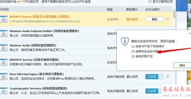 ③若管家啟動(dòng)項(xiàng)中有百度殺毒、百度衛(wèi)士相關(guān)服務(wù),先禁用/刪除對(duì)應(yīng)項(xiàng)。
