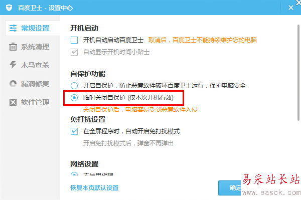 ②在百度殺毒、百度衛(wèi)士的設(shè)置中心中關(guān)閉自保護(hù),并退出百度殺毒、百度衛(wèi)士。如下圖: