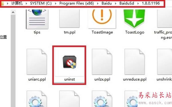 2、進入百度殺毒默認安裝路徑:C:/Program Files (x86)/Baidu/BaiduSd,雙擊uninst卸載程序,進行常規卸載。