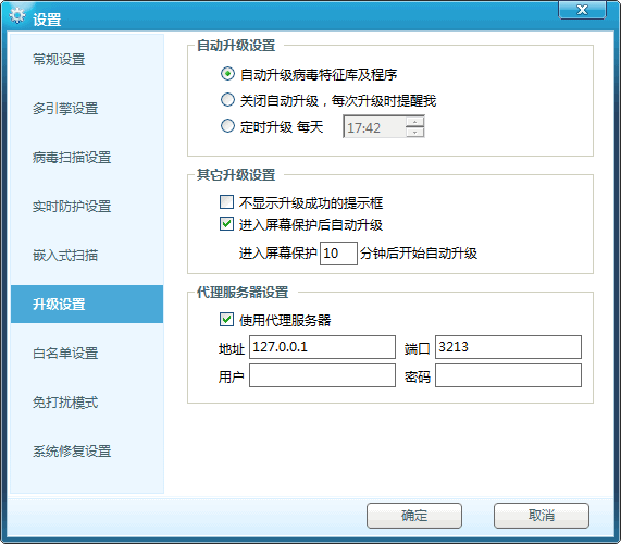 設置完成后可前往客戶端電腦上的360殺毒進行驗證,打開360殺毒的“設置”對話框,并選擇“升級設置”,即可看到代理服務器設置: