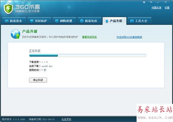 設(shè)置好了之后回到主界面,點擊"產(chǎn)品升級"標(biāo)簽,然后點擊"檢查更新"按鈕進行更新。升級程序會連接服務(wù)器檢查是否有可用更新,如果有的話就會下載并安裝升級文件: