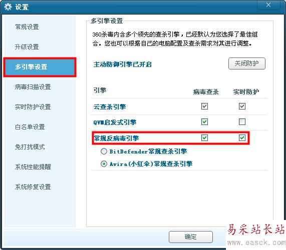 360殺毒3.0版本默認不安裝本地引擎病毒庫,如果您想使用本地引擎,請點擊主界面右上角的"設(shè)置",打開設(shè)置界面后點"多引擎設(shè)置",然后勾選上常規(guī)反病毒引擎查殺和防護,您可以根據(jù)自己的喜好選擇Bitdifender或Avira常規(guī)查殺引擎,選擇好了之后點確定按鈕: