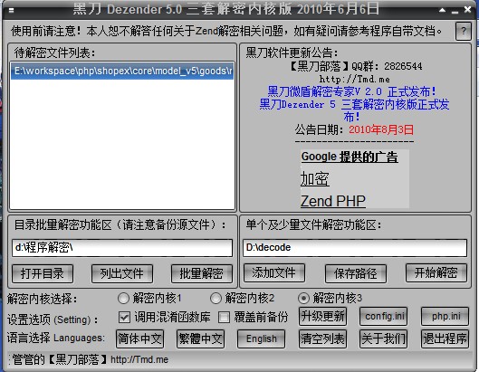 選擇 “解密內核3”,經測試,其他兩個都不能正常解密php文件。
