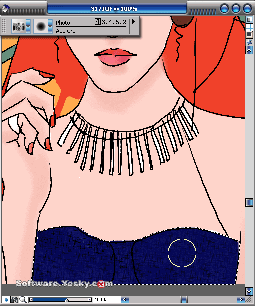 5.用套索工具選取衣服部位,使用1954 graphic fabric的紙紋。使用【photo】/【add grain】(相機/添加顆粒)的筆刷在選區內涂抹。(圖3.4.5.1和圖3.4.5.2所示)