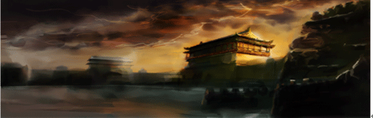 在大多數的設計概念圖過程中,都是劇組拿著我們的概念圖去搭制場景,因此我們在繪制時不可能現場寫生,只能通過一些圖片資料和平日的積累來逐步豐富畫面。我們來設計一下這個場景的氛圍:重重的陰云與硝煙攙雜著,壓得人喘不過氣來;暗黃色的陽光照在城門上;近處堆放著一堆堆燃燒過的殘骸;一場大戰過后,團城內一片死寂。