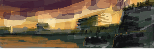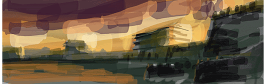 對一幅概念圖來講我們首先要抓住兩點一是光感、二是透視,細節并不是概念圖需要解決的問題,除非你打算像《黑客帝國》的概念設計師那樣變態的追求細節。上一步我們利用6d美術筆模仿馬克筆快速概括出畫面的光位和空氣透視。接下來需要刻畫表達主體建筑,調整畫面整體的虛實關系。為了使畫面清透且濕潤,我們換用手指工具,結合6d美術筆“擦”出云層的水彩效果;然后用普通筆刻畫重點建筑。兩種不同的工具混合,效果也大不一樣,畫面的虛與實很自然的被拉開了。