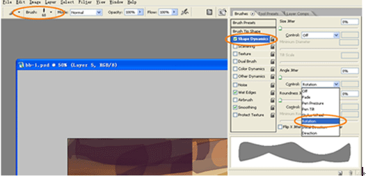 在photoshop中設置我們所需要的畫筆形式,使其更接近馬克筆的效果。如圖所示打開6d美術筆的rotation(旋轉)屬性,這樣才能夠更好的發揮6d美術筆的獨特特性——旋轉筆尖,繪制出真實流暢的筆鋒效果。