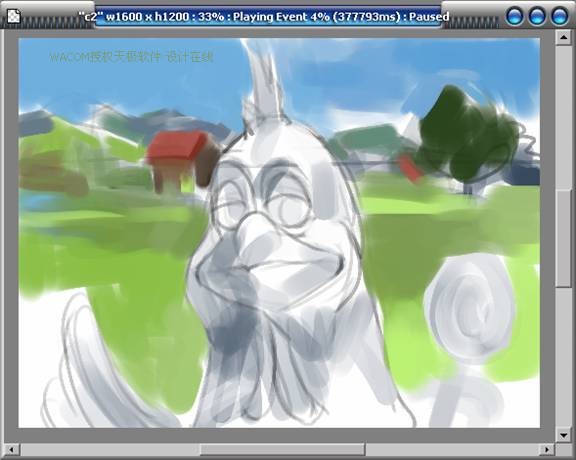 6.開始塑造主體對象,畫出卡通雞的頭部體積關系。由于intuos3數(shù)位板的1024級壓感筆等功能,使得從草圖到上色都可以非常自然的完成。