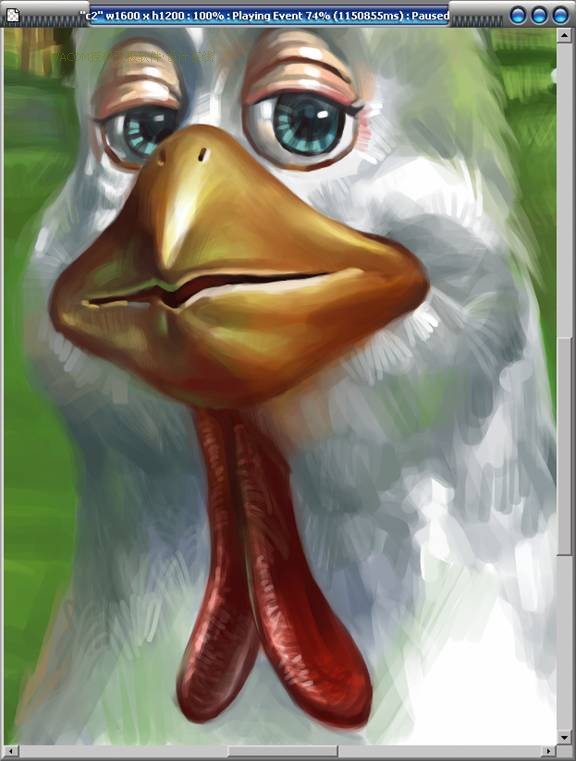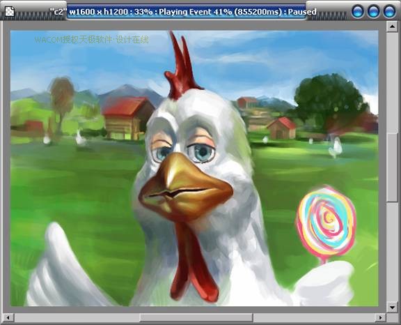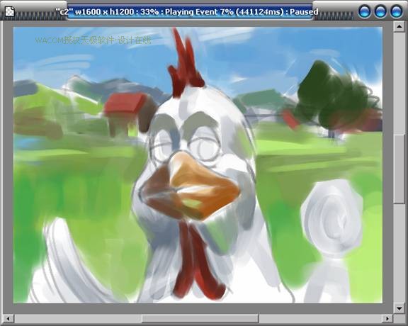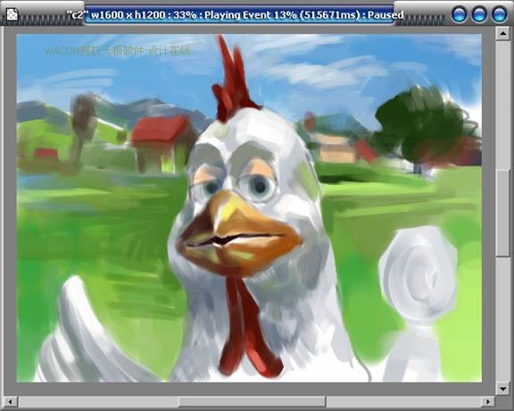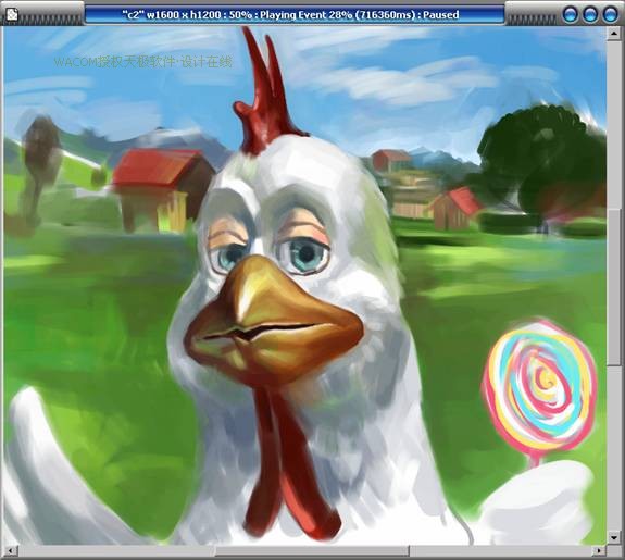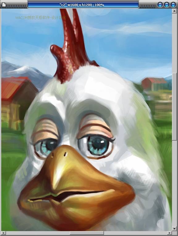 11.刻畫雞冠的部分,用點狀的筆觸表達特定的紋理質(zhì)感,同時注意和整體體積的依附關系。opencanvas3 的軟件對于intuos 3數(shù)位板的支持非常優(yōu)秀,可以充分利用運筆壓感來控制筆觸效果,非常便捷。