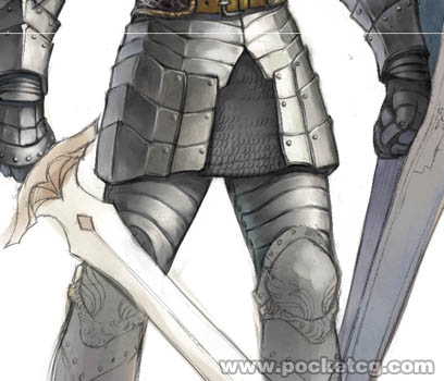 開始刻畫胸部的鎧甲。我選擇了【pavement】這個紙張紋理,因為我認為這能很好地制造出帶點斑斑銹跡的鋼鐵肌理。加強明暗面的對比度才能體現金屬的質感,這是金屬區別于其它質地的地方。在暗部再加上一些冷色系的反光色,效果會更好。現在人物胸部的鎧甲已經有金屬的感覺了。