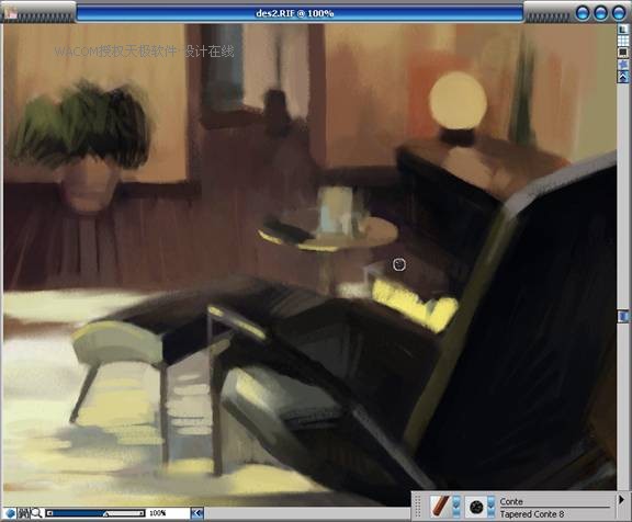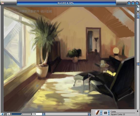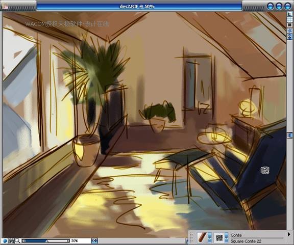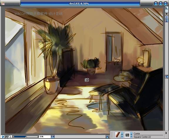 3.回到canvas層,使用conte/square conte 22的筆刷進行初步的上色,畫出主要的光影區域。這張效果圖,我將重點表現光影效果,給畫面增添一些戲劇性的效果。