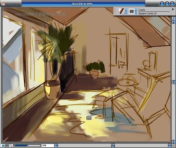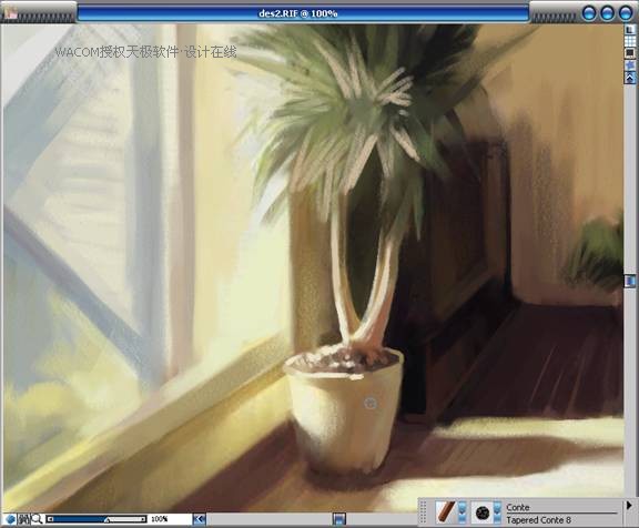 8.切換使用tapered conte 8的筆刷,局部放大視圖,刻畫窗前的盆載。