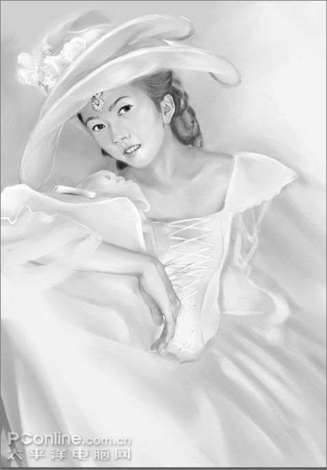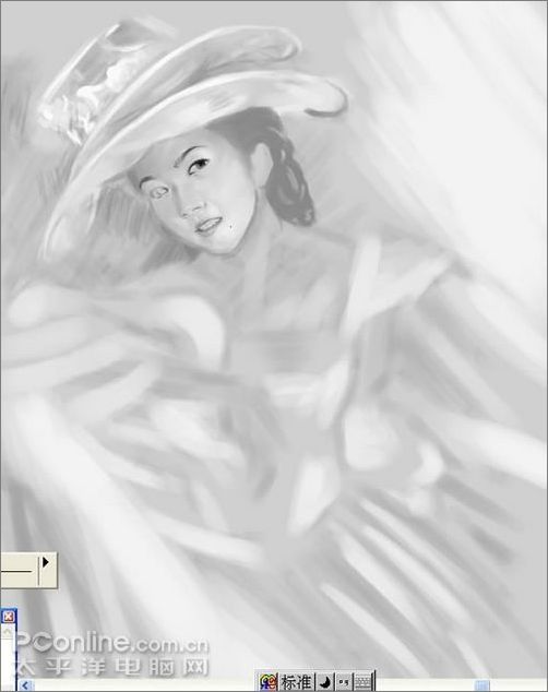 1、在pt里用數碼噴筆將不透明度條到5%,濃度35%.用黑白直接撲出大體色塊,抓住形態,再就是注意光影。