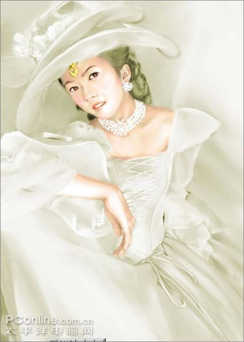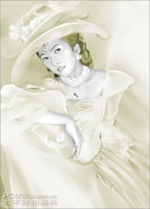 9、還是用噴筆畫出項鏈和耳墜,話的時候可以提高一下不透明度,然后用粉蠟筆中的硬制粉蠟筆將紙紋調成精細網點,畫出帽子和衣服上的紗,此處注意筆觸,要虛實分開。