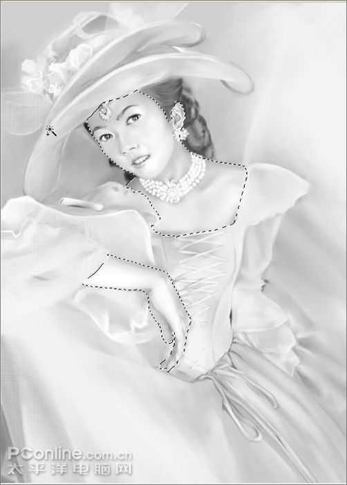 現在開始將軟件轉換成ps!(我一直是在背景層進行繪制的)在ps中用快速蒙板精細的摳出皮膚部分,并且存儲選區,為了以后方便嘛~!選取皮膚部分,調整一下亮度和對比度,使皮膚看起來白皙。