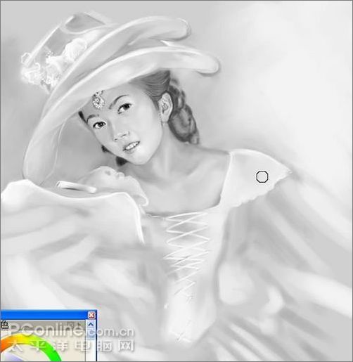 8、衣服和背景全部搞定,這步之前全部是用黑白2色畫的,注意!眼睛也畫出來了,點上高光確實有神多了,沒白忙半天...現在你離顯示器10米,看像不像照片,一定得10米啊,不然該看見畫了......