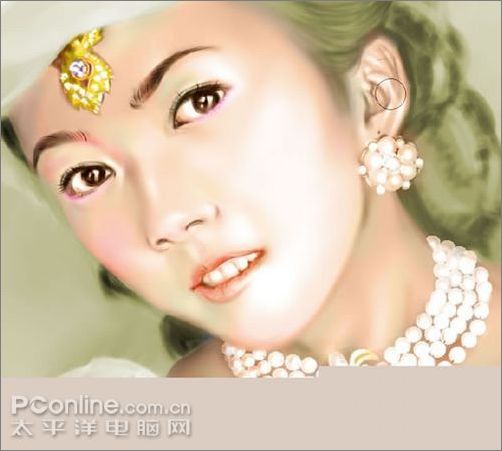 14、嘴唇我復制了一層,然后執行"濾鏡—雜色—加雜色",然后鉤選''高斯分布'',調整數值到你滿意.然后用橡皮工具擦除不需要的部分.這是處理完的效果.順便為首飾上了色.還是噴筆.小技巧:如果你認為某部分皮膚過渡不夠自然,復制圖層,選擇"濾鏡—雜色—蒙塵與劃痕",調整到自己滿意.然后用橡皮工具調低不透明度,擦除復制層上原來你滿意的地方,然后合并圖層,可反復進行。