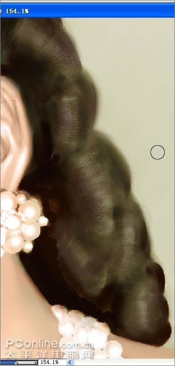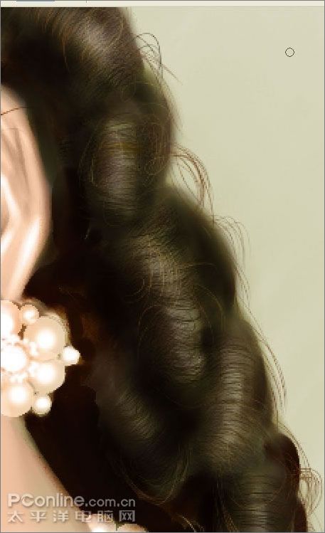 17、現在轉到pt里,我感覺pt畫頭發方便,它可以很方便的旋轉畫布。先新建一層,用噴筆畫出暗面,然后再用炳稀畫筆里的干畫筆在高光處用棕色畫幾筆,讓他有發絲的感覺。