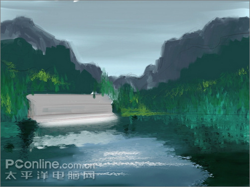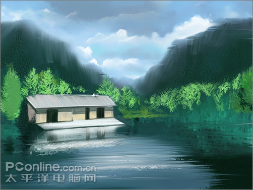 3、這里我選用載色刮刀結合數碼板的壓感繪制的房屋。然后轉成薄刮刀融和畫面的顏色,尤其是水面。還是印象派油畫筆繼續加工樹木。