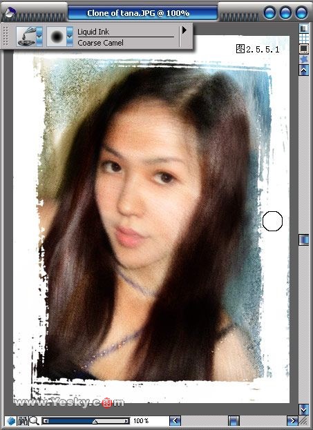 5.合并圖層,新建一個液態(tài)墨水圖層。使用【liquid ink】/【coarse camel】(液態(tài)墨水筆/粗糙駝毛筆)的筆刷變體,選用白色,大致畫一個邊框。(圖2.5.5.1和圖2.5.5.2所示)
