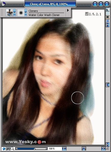 4.用【drop all】的命令合并所有的圖層。新建一層,選用【cloners】/【soft cloner】(克隆/柔性克隆)的筆刷變體,按數(shù)字鍵【1】把筆刷不透明度改為10%。在人物的五官部位輕輕地涂抹,恢復部分細節(jié)。(圖2.5.4.1和圖2.5.4.2所示)