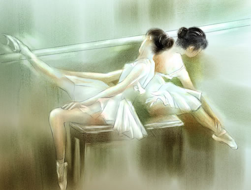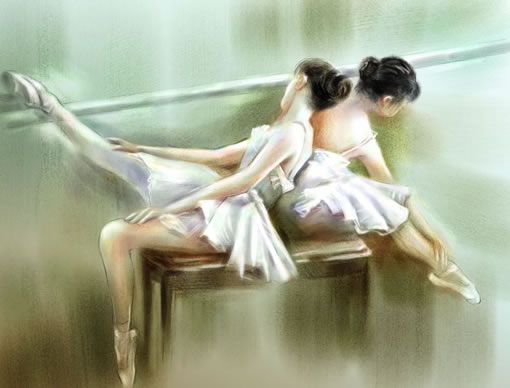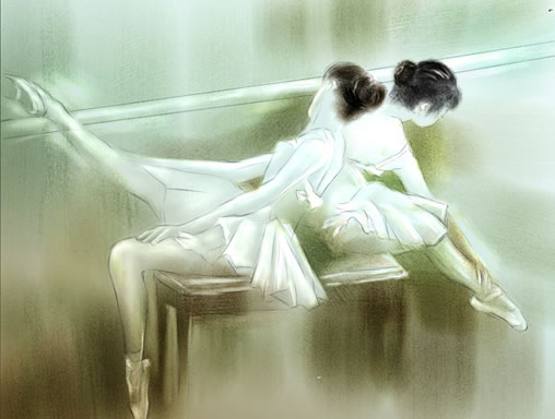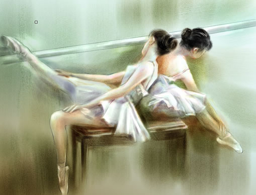 7、用water color/ wash bristle的畫(huà)筆,在brush controls面板中把feature調(diào)到2左右,并選取合適的顏色進(jìn)行大色塊的繪畫(huà)。在繪畫(huà)時(shí),我們要注意用利用wacom影拓2畫(huà)筆的敏感性,畫(huà)出輕松和富有變化的筆觸。(效果見(jiàn)圖六)