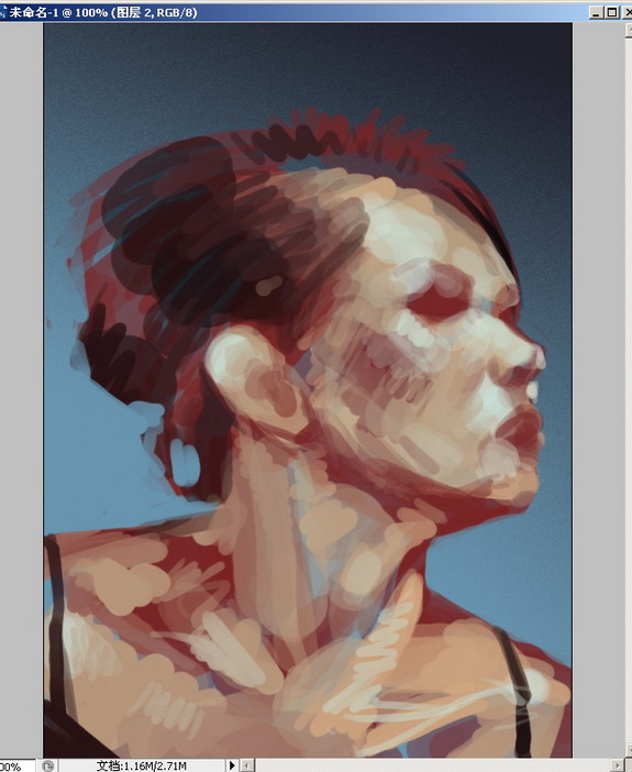 1、新建畫布,用漸變工具在背景層拉出一個(gè)漸變。新建一層,開始繪制人物。用基本圓頭筆刷,先用大色塊表現(xiàn)出人物的基本形態(tài)和顏色分布。這步最重要的是抓住比列,將大形態(tài)表現(xiàn)出來就可以。注意筆觸按結(jié)構(gòu)走,盡量放松些。