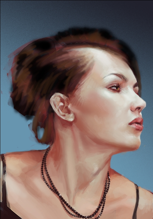3、調(diào)小筆刷直徑,進(jìn)行細(xì)節(jié)刻畫,有時(shí)候保留部分筆觸會(huì)使畫面更耐看。友基板的高精確度在繪制曲線時(shí)能使你更得心應(yīng)手。注意五官的透視。項(xiàng)鏈部分我是按f5,在畫筆設(shè)置里將畫筆間距調(diào)大,然后刷出的黑色部分,再選擇性的添加些高光。