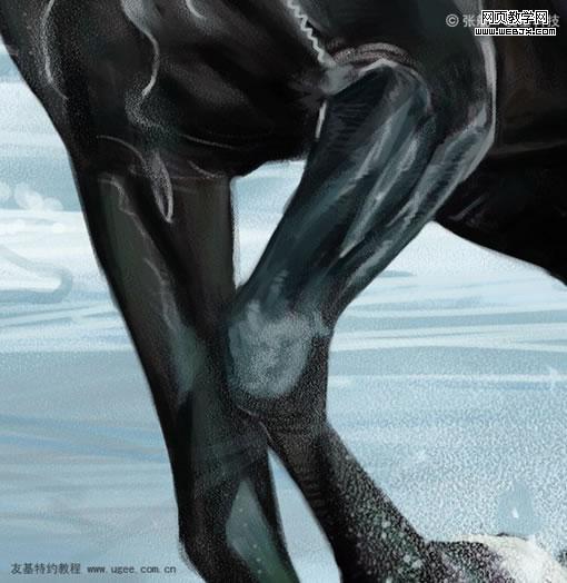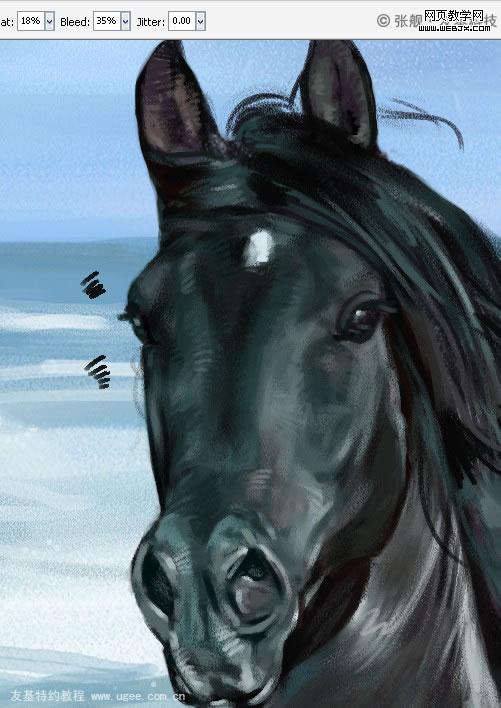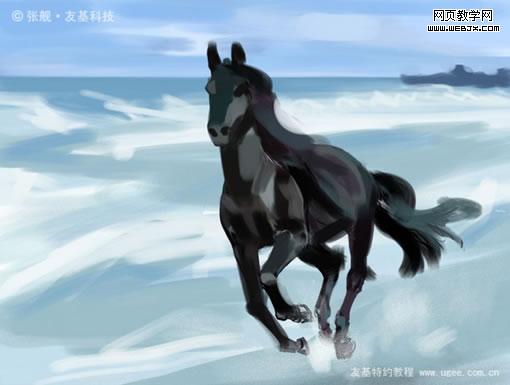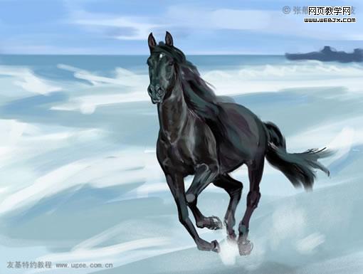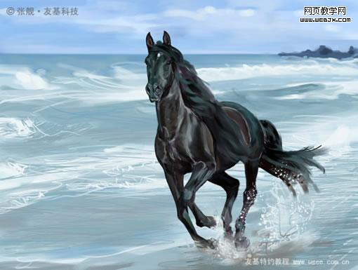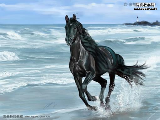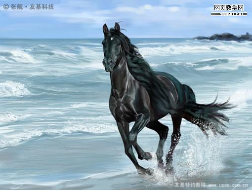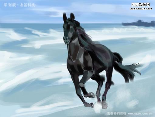 9.進一步深入刻畫背景海浪以及馬匹,繪制自然景致時越放松往往效果越好。