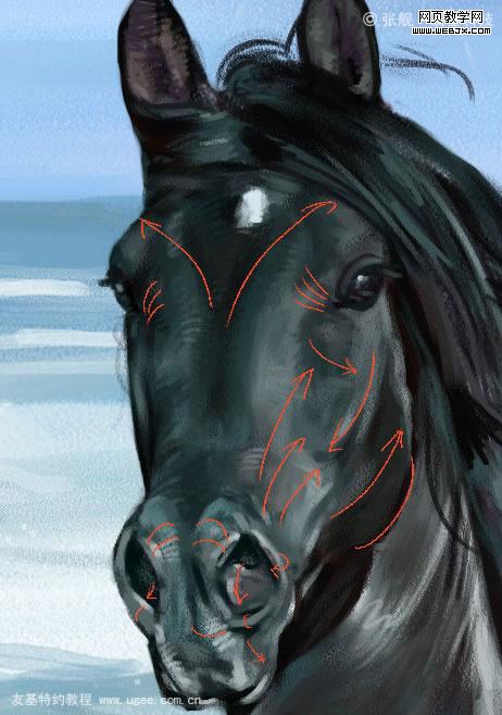 6.繼續深入畫面,對視覺中心的馬匹的頭部進行細節刻畫。注意頭部的微妙變化。