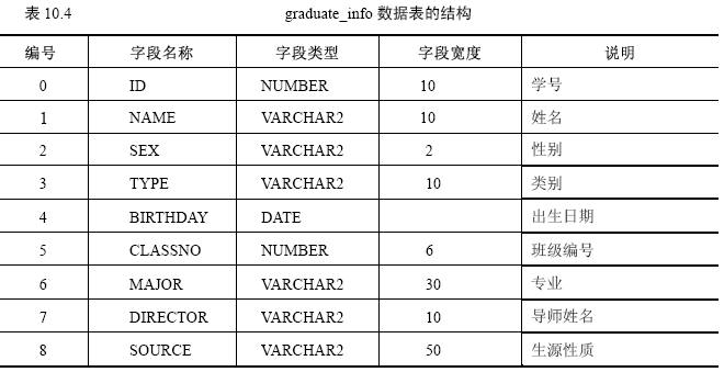 數(shù)據(jù)表名稱:graduate_info。數(shù)據(jù)表結構如表10.4所示。