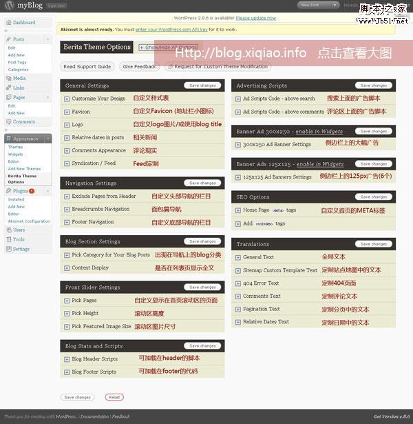 在左側菜單的Appearance里可以發現多了一項Berita Theme Options .這就是定制系統。如下圖。我做了粗略的說明。