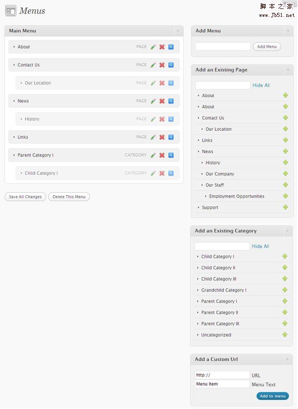 菜單管理器是WordPress 3.0里的一個新功能, 由WooThemes的WooNav開發。 你可以利用菜單管理器創建多個菜單和分類,甚至可以定制內外部鏈接。 這個菜單管理器甚至帶有一個默認的widget,你可以把它安置到任何支持widget的地方。